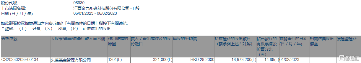格隆汇2月6日丨根据联交所最新权益披露资料显示,2023年2月1日,金力永磁(300748)(06680.HK)遭朱雀基金管理有限公司在场内以每股均价28.20港元减持32.1万股,涉资约905.22万港元。